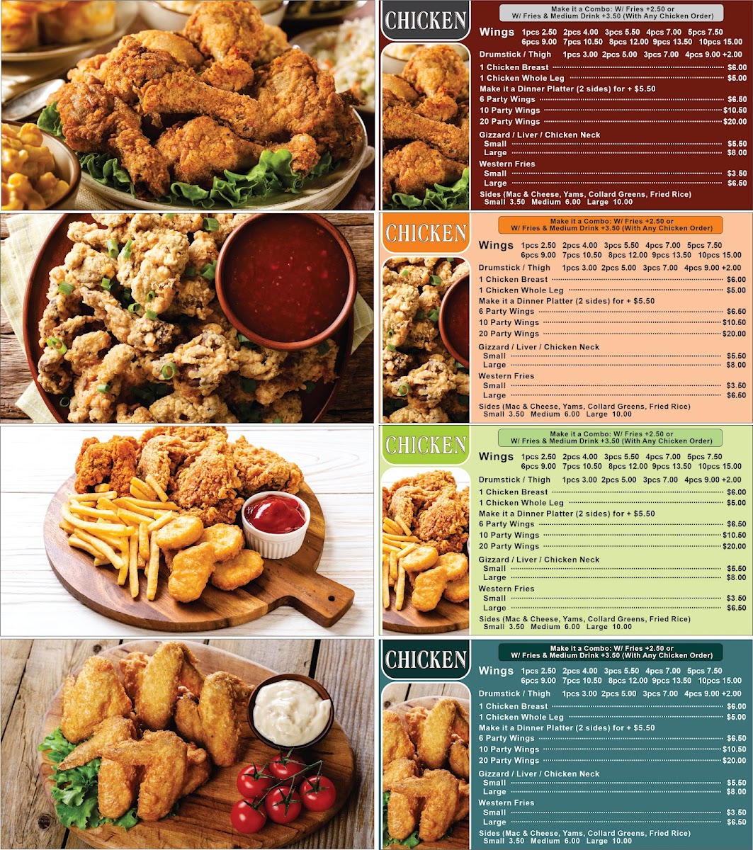 Typical menu highlights include crispy chicken wings seasoned with lemon pepper or paired with their signature mumbo sauce. Alongside these, there are options like chicken necks, gizzards, and a variety of fries that add a crunchy, savory touch to your meal. The menu also features comforting platters such as pancakes, French toast, and waffles, making it a versatile spot for breakfast or brunch as well.
